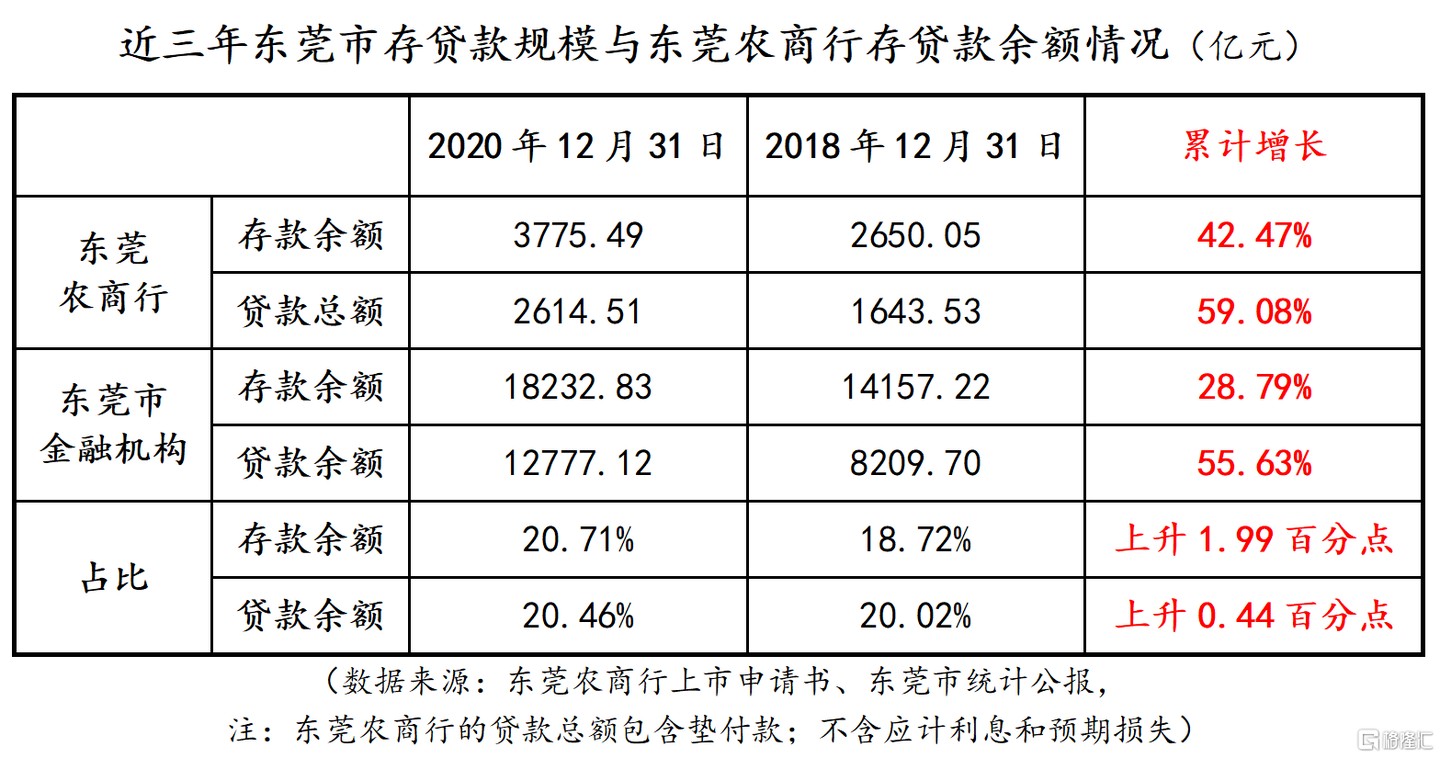 而從同期,東莞農商行的存款餘額為 3775.49 億元,相比於 2018 年末累計增長 42.47%,遠高出全市存款餘額同期增速 13.68 個百分點;貸款總額(包含墊付款,不含應計利息和預期損失)達 2614.51 億元,相比於 2018 年末累計增長 59.08%,也明顯高於全市貸款餘額增速 3.45 個百分點。