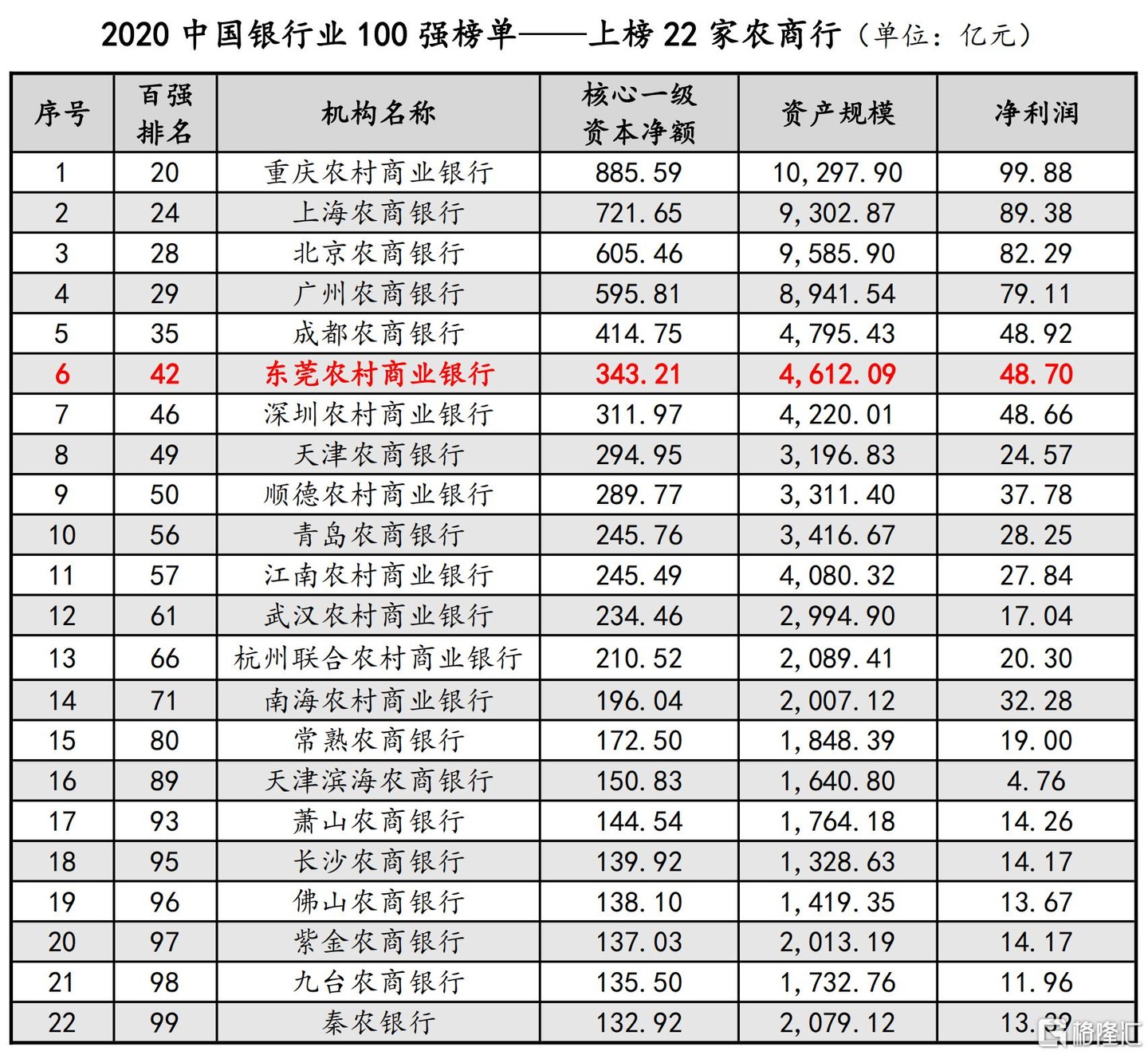 2021 年 3 月,中國銀行業協會發布《2020 年中國銀行業 100 強》榜單,榜單以核心一級資本淨額(截至 2019 年 12 月 31 日)做依據,東莞農商銀行以 343.21 億元的核心一級資本淨額位列百強榜單第 42 位。同時,在入圍全國百強銀行的 22 家農商行中位列第六名,且在所有入圍的地級市農商行位列第一名。