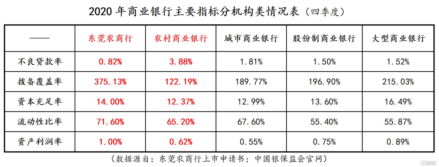 中國銀保監會公佈的 “2020 年商業銀行主要指標分機構類型情況數據” 來看,2020 年四季度全國農商行的平均不良率為 3.88%;全國農商銀行的平均撥備覆蓋率為 122.19%。從行業水平比對看,0.82% 的超低不良率和 375.13% 的超高撥備覆蓋率,東莞農商行的資產質量已是遠優於全國農商行的平均水平,已經達到媲美股份制銀行的水準。