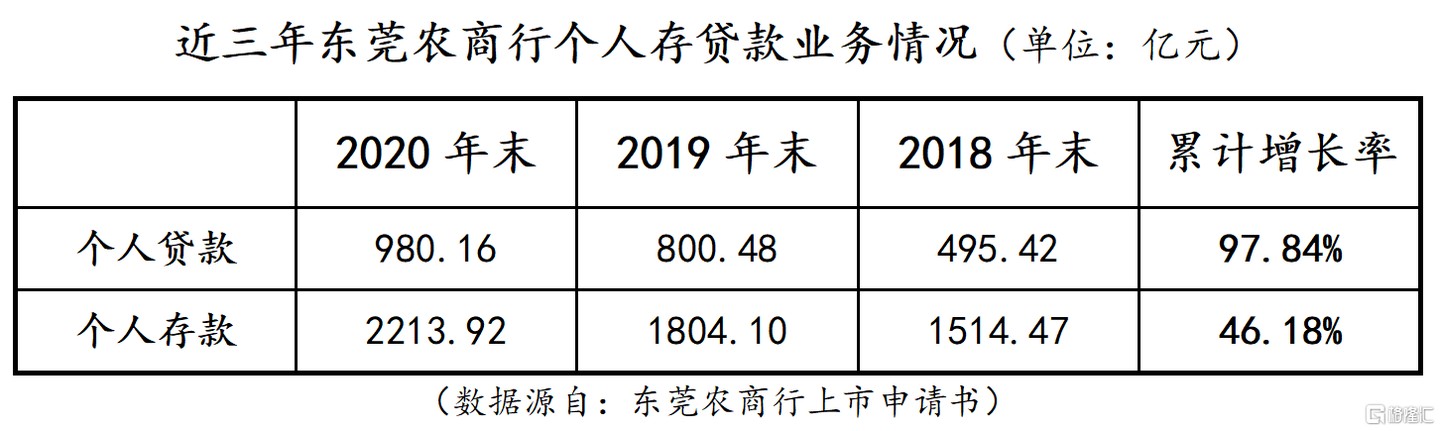 另一方面,截至 2020 年 12 月 31 日,東莞農商行的個人貸款餘額為 980.16 億元,相比於 2018 年的 495.42 億元,累計增長 97.84%;個人存款餘額為 2213.92 億元,相比於 2018 年的 1514.47 億元,累計增長 46.18%。