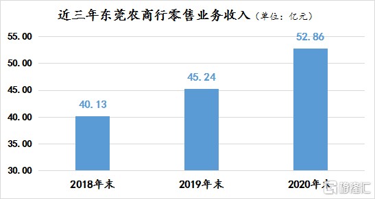 上市申請書顯示:截至 2020 年 12 月 31 日止年度,東莞農商行的零售銀行業務收入達 52.86 億元。相比於 2018 年的 40.13 億元淨增 12.73 億元,累計增長 24.08%。零售銀行業務收入佔比也從 2018 年的 41% 上升至 2020 年的 43.90%。