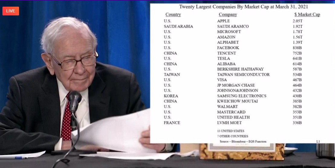 巴菲特列舉了截止 2021 年 3 月 31 日的全球 20 個市值最大上市企業,前六個公司中有 5 家是美國公司,除了當地政府控股的沙特阿美。巴菲特認為這説明美國環境利好,而 30 年前的全球 20 大市值排名中眾多的是日本公司: