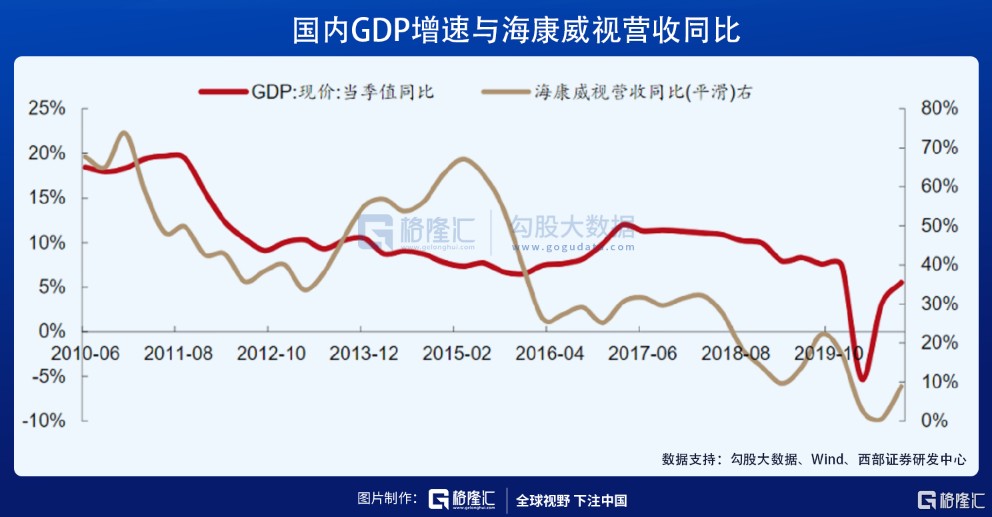海康威視的特點是營收增速與國內 GDP 增速顯著正相關。由於視頻物聯行業覆蓋廣、需求碎片化,平均訂單顆粒度較小,因此行業受宏觀經濟影響較大。西部證券研究發現,海康營收增速與國內 GDP 增速總體呈現較高程度正相關,經濟與政策出台的影響一般會滯後半年左右的時間反應在公司的收入端。