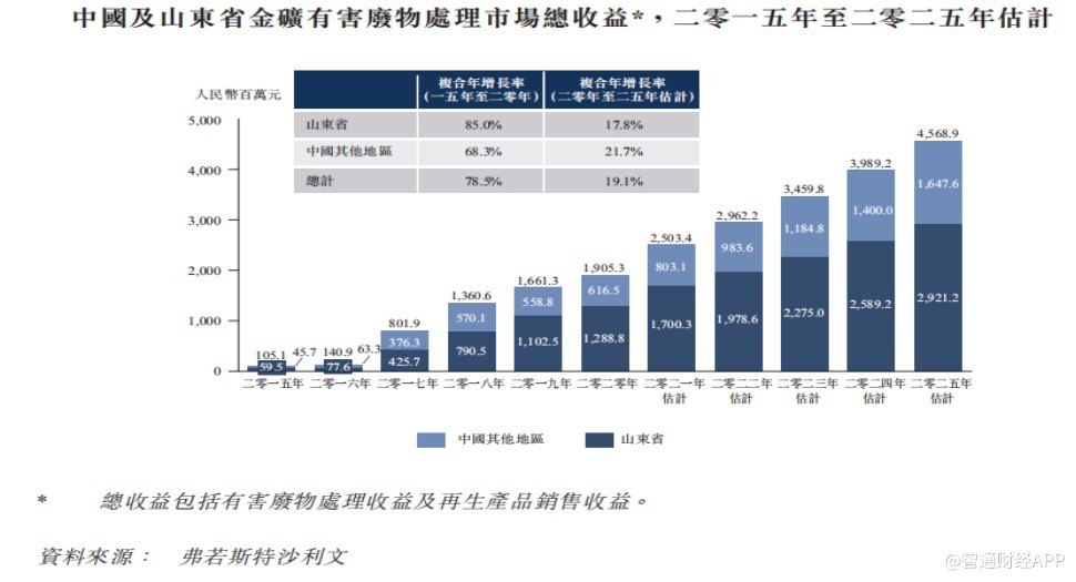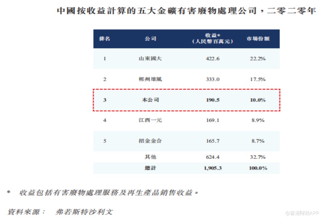 據弗若斯特沙利文報告,按 2020 年收益計算,公司是中國第三大金礦有害廢物處理公司,佔約 10% 市場份額。按金礦有害廢物處理量計算,公司于山東省及中國排行第一,實際處理量為約 108 萬噸,佔 2020 年山東省及中國總實際處理量分別約 25.8% 及 17.6%。