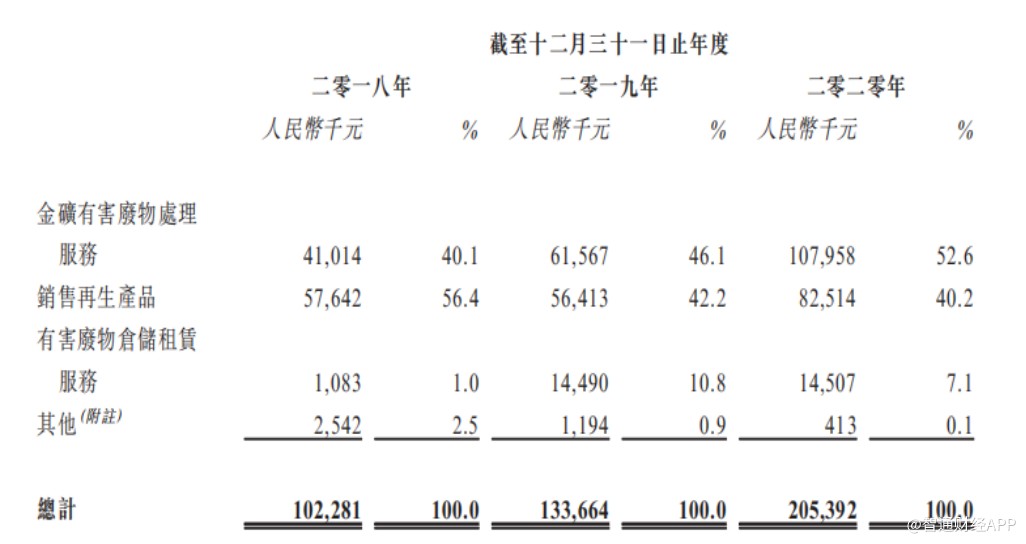 過去三年,金礦有害廢物處理服務及銷售再生產品的收益,為鴻承環保主要收益來源,分別佔期間總收益的約 96.5%、88.3% 及 92.8%。自 2018 年 11 月起,公司開始從有害廢物倉儲租賃服務獲得收益。