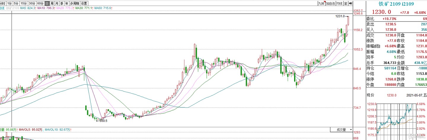 昨晚,國內期市夜盤收盤,黑色系普漲,鐵礦石漲 4.38% 報 1203.5 元/噸,續刷合約歷史新高。動力煤漲 3.5%,焦炭、焦煤分別漲 2.88%、2.05%。今日,鐵礦主力合約漲超 6%,報 1230 元/噸。