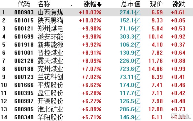 A 股方面,煤炭相關概念領漲。山西焦煤、陝西黑貓漲停、潞安環、鄭州煤電、新集能源漲超 9%,晉控煤業、山煤國際、開灤股份等也都集體上漲。