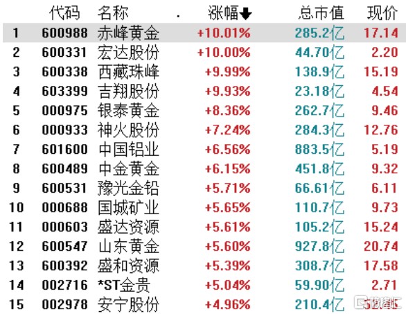 有色板塊亦集體走強,赤峯黃金、宏達股份漲停、西藏珠峯、跡象股份漲超 9%。山東黃金漲超 5%,紫金礦業漲超 3%。