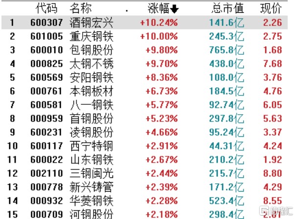 同時,鋼鐵板塊強勢拉昇,重慶鋼鐵、酒鋼宏業漲停,太鋼不鏽漲逾 9%,安陽鋼鐵漲超 8%,其餘個股也都漲勢強勁。