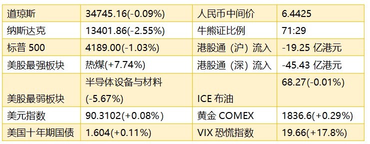 1、隔夜美股截至收盤,道瓊斯指數跌 32.60 點,跌幅 0.09%,報 34745.16 點;標普 500 指數跌 43.60 點,跌幅 1.03%,報 4189.00 點;納斯達克綜合指數跌 350.38 點,跌幅 2.55%,報 13401.86 點。港股 ADR 指數下跌,按比例計算,恒生指數收報 28362 點,跌 232.8 點或-0.82%。