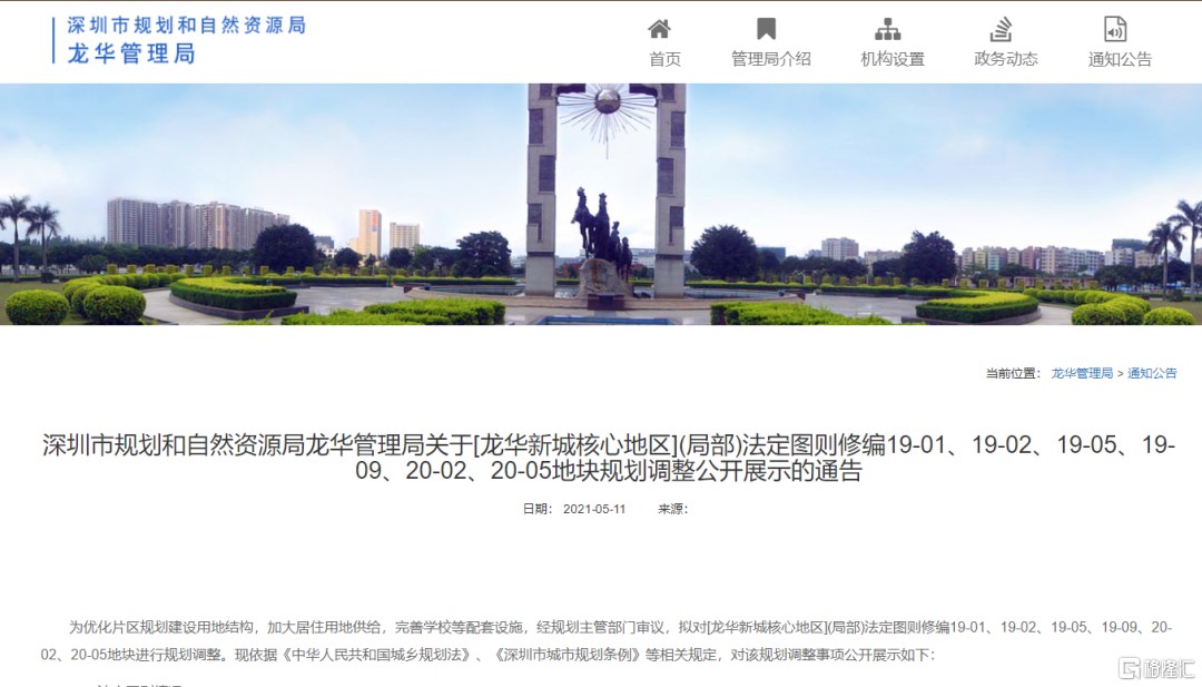 5 月 11 日,深圳市规划和自然资源局龙华管理局公示了,[龙华新城核心地区] 法定图则修编 19-01、19-02、19-05、19-09、20-02、20-05 等 19 个地块及周边道路规划调整。