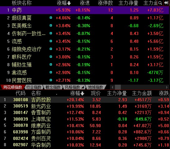 盤面上,中藥板塊掀漲停潮,吉藥控股、新光藥業等近十股漲停,江中藥業漲超 9%,貴州百靈、華森製藥跟漲。