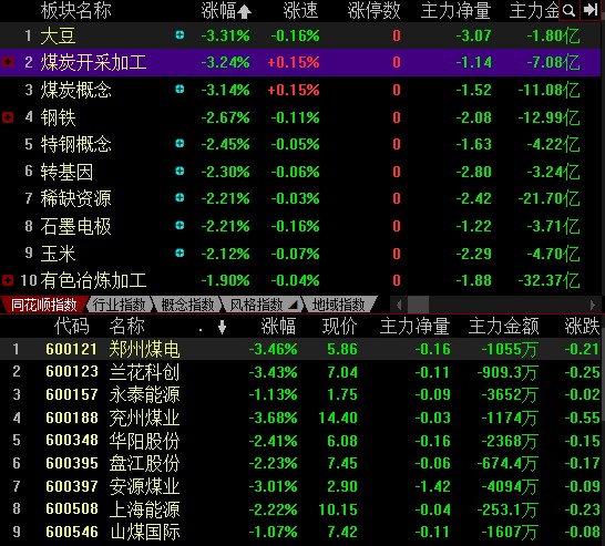 板塊上,大宗期貨價格全線大跌,導致煤炭、鋼鐵、有色等資源股成市場殺跌主力,萬華化學等權重亦拖累指數下行。