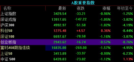 截止收盤,滬指跌 0.96%,深成指跌 1.05%,創業板指跌 0.57%。