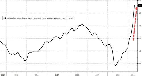剔除波動性較大的食品和能源的核心 PPI 同比上漲 0.7%。看着還可以?進一步剔除貿易,核心 - 核心 PPI 的同比增幅達到了 4.6%,同樣創出了有記錄以來最高水平,高於預期的 3.8%。
