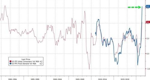 PPI 指數跟蹤生產成本變化。新冠疫情後復甦帶來的供應瓶頸和短缺已經導致大宗商品價格飆升。同時,勞動力成本也開始上升。除非公司轉嫁成本並提高生產率,否則利潤率將面臨威脅。