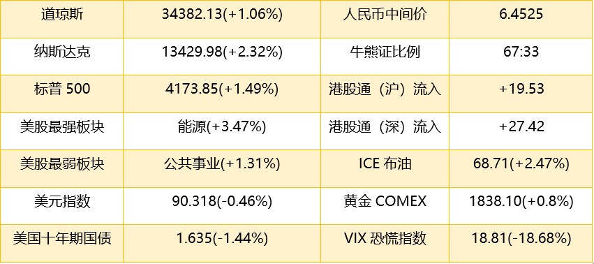 1、上週五美股截至收盤,道瓊斯指數漲 359.30 點,漲幅 1.06%,報 34,382.13 點;標普 500 指數漲 60.72 點,漲幅 1.49%,報 4,173.85 點;納斯達克綜合指數漲 304.99 點,漲幅 2.32%,報 13429.98 點。上週道指累計下跌 1.1%,標普 500 指數下跌 1.4%,納指下跌 2.3%。港股 ADR 指數也上漲,按比例計算,收報 28253 點,漲 225.74 或 0.80%。