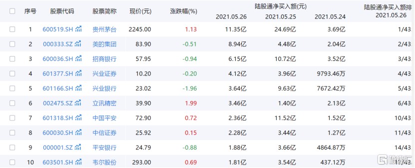 前三個交易日中,貴州茅台獲北向資金淨買入近 40 億元高居首位。招商銀行、興業證券、興業銀行、中信證券等均排在前十,金融業個股佔前十比超 50%。