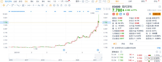 今日上漲與其昨晚披露的 2021 年前三個月的經營數據無不關係。該經營數據顯示,現代牙科 1 季度實現收益 7.01 億港元,同比增長 32.7%,毛利率高達 52%-54%,純利率介乎 15% 至 18% 之間。其中,公司在中國內地收益為 0.97 億港元,同比增長 232.5%,較 2019 年同期增長 39.5%。