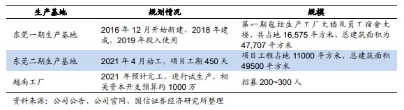 目前東莞一期已經於 2019 年投產,越南工廠預計今年可進行試生產,東莞二期已經開工建設,預計 2022 年可竣工。未來產能投放,公司將進一步打開國內市場。