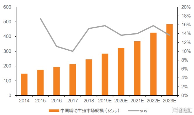 根據弗若斯特沙利文的數據顯示,2015 年中國輔助生殖市場規模僅為 176 億元,到了 2020 年,市場規模大幅飆升為 330 億元。五年時間,市場規模增長了 87.5%,年均複合增長率為 17.5%。預計我國輔助生殖市場規模在 2023 年將達到 452 億,增量空間巨大。