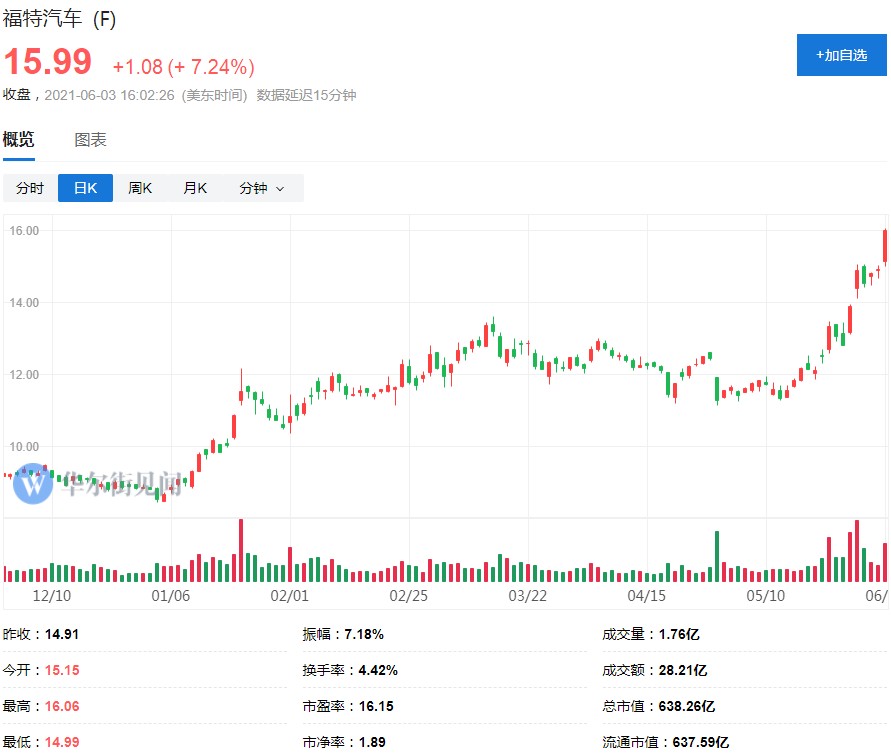 消息公佈後,福特股價受到利好應聲大漲,收漲 7.24% 至 15.99 美元,創下自 2014 年 9 月以來的近 7 年新高。