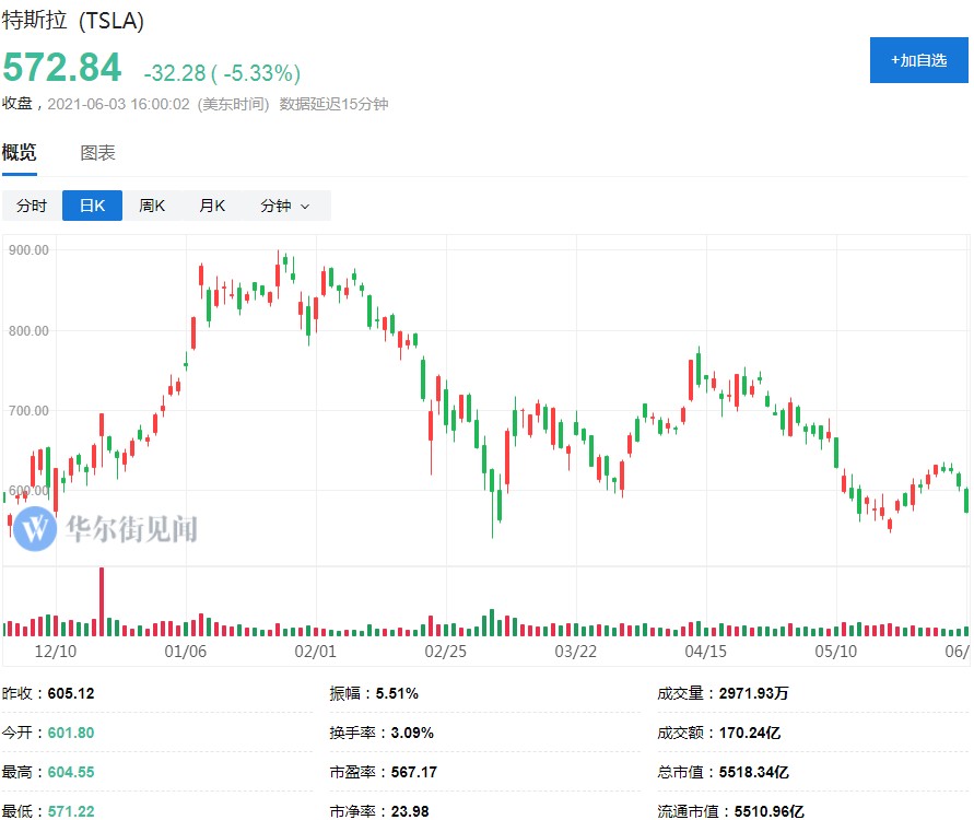 上個交易日大跌 3% 的特斯拉,隔夜美股盤中再次大跌,最終收跌 5.33%,報 572.84 美元,市值一天蒸發 310 億美元(約合人民幣 1990 億元)。