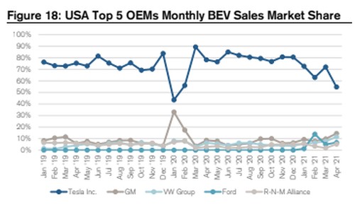 瑞信此前發佈報告稱,特斯拉 4 月全球市場份額出現下降,由 3 月份的 29% 驟降至 4 月份的 11%。這是特斯拉自 2019 年 1 月以來月度全球市場份額最低的一次。