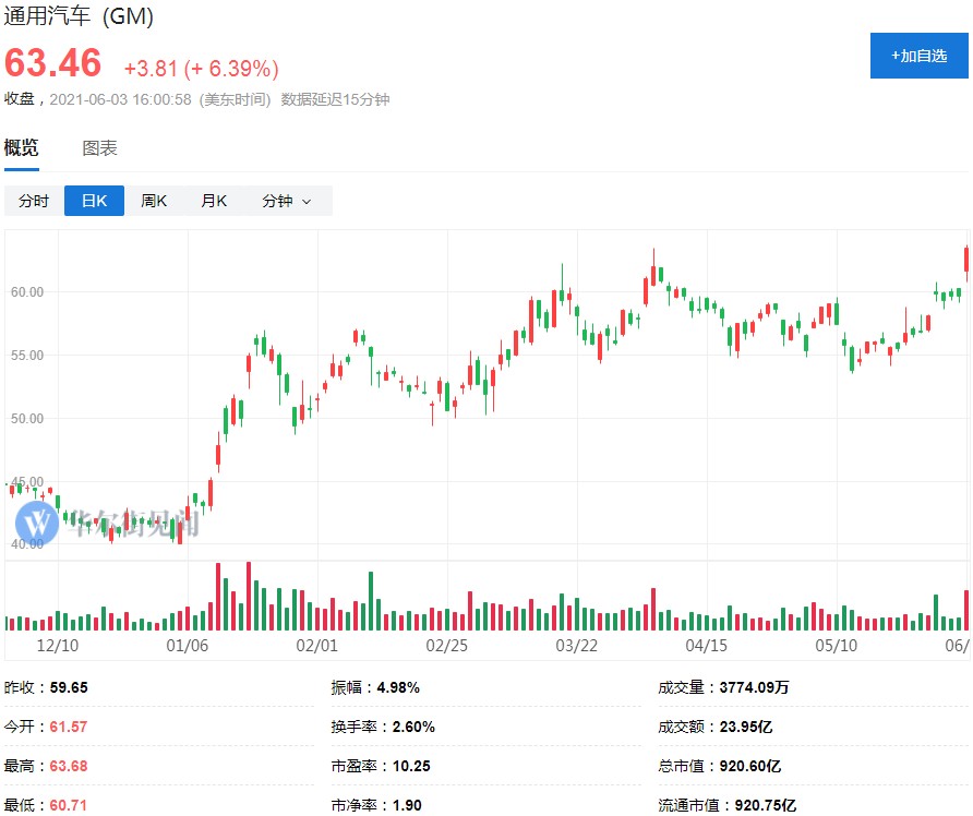 隔夜美股,通用高開高走,收漲 6.39% 至 63.46 美元,股價逼近新高。