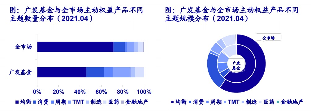 其中,廣發基金有 54% 的主動權益產品具備鮮明主題/賽道,其中 TMT 和消費板塊各 4 只,週期與醫藥各 2 只,規模佔比明顯超出全市場的有醫藥、週期和 TMT。