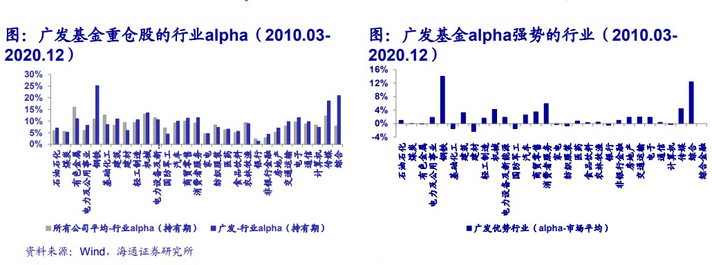 海通證券還發現,從公司所有重倉股相對行業的 alpha 來看,廣發的數字只在極少數行業上明顯弱於市場平均,説明公司無顯著短板行業;從基金經理的個體 alpha 層面來看,結果同樣如此。