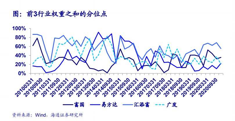 此外,廣發在行業上的重配行為並不突出,重倉行業權重在全市場的分位點,近幾年都低於 50%,近 2 年在 30% 附近。