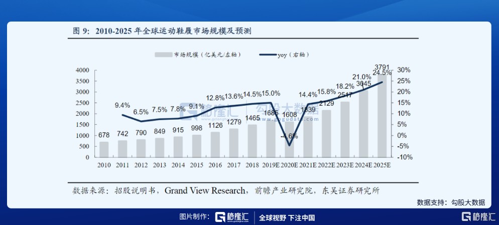 從市場規模來看,市場規模由 2010 年的 678 億美元增長至 2018 年的 1465 億美元,CAGR 為 10.1%,根據前瞻產業研究院預測,2020 年受新冠疫情影響,市場規模預計同比小幅下降 4.6%,2021 年起運動鞋履市場規模有望恢復高速增長,21-25 年 CAGR 保持在 14% 以上,2025 年全球運動鞋履市場規模預計將達到 3791 億美元。