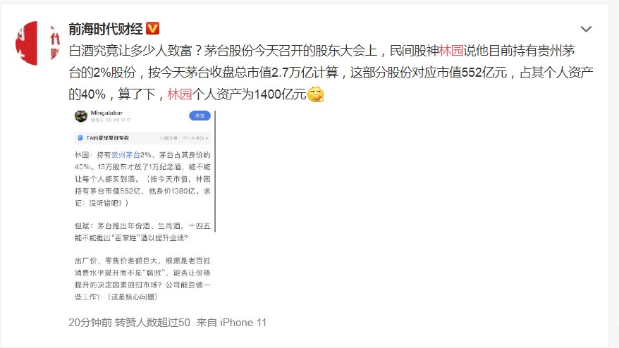 贵州茅台股东大会亮点:林园 “别让股东求着经销商买酒”,但斌 “建议拆股”