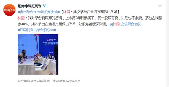 证券市场红周刊报道称,深圳林园投资董事长林园在会上表示,建议茅台在售酒方面做出改革。