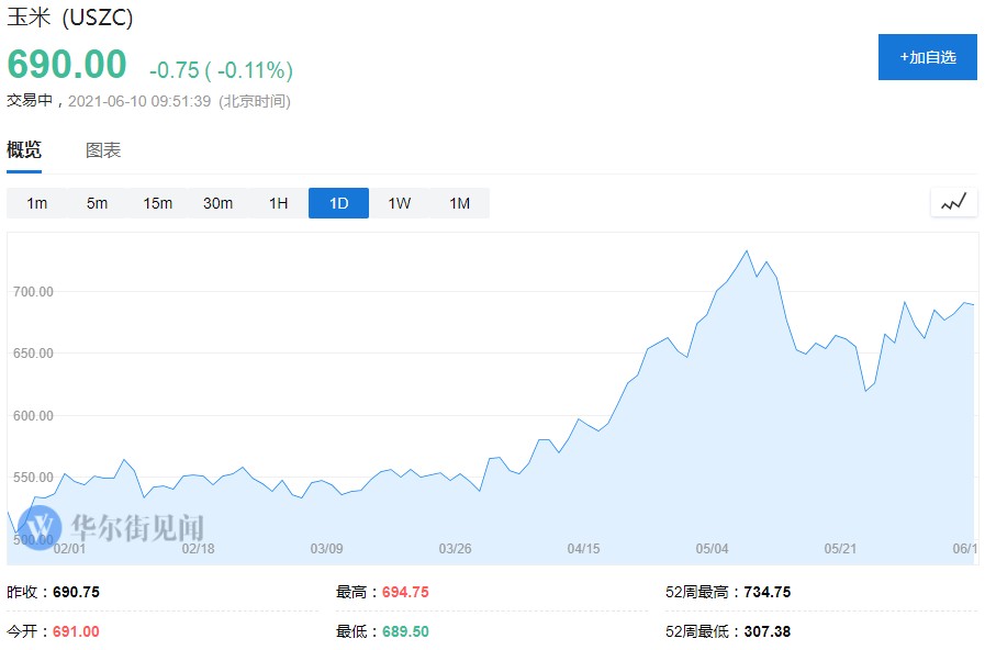 6 月 9 日,芝加哥期貨交易所的玉米 7 月合約收報每蒲式耳 6.9075 美元,比前一交易日上漲 1.58%。今年以來,玉米期貨價格累計大漲近 40%。
