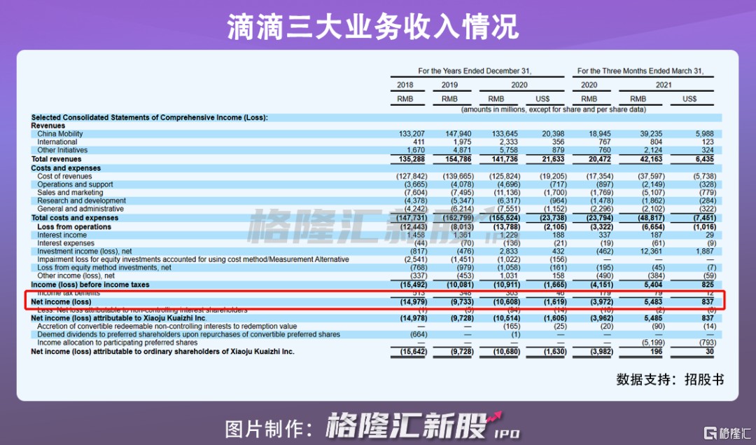 招股書顯示,滴滴 2018 年、2019 年、2020 年總營收分別為 1353 億元、1547.86 億元、1417.36 億元;淨虧損分別為 150 億元、97 億元及 106 億元。