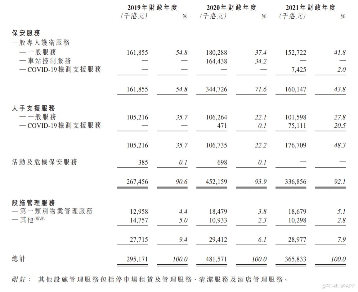 公司的主要業務為保安服務及設施管理服務,提供單一服務、多種服務或綜合服務。招股書顯示,公司的收入較 2019 年財政年度的約 2.952 億港元增加約 1.864 億港元至 2020 年財政年度的約 4.816 億港元,收入增長主要由於保安服務分部產生及設施管理服務分部產生的收入增加。收入隨後減少約 1.157 億港元至 2021 年財政年度的約 3.658 億港元。