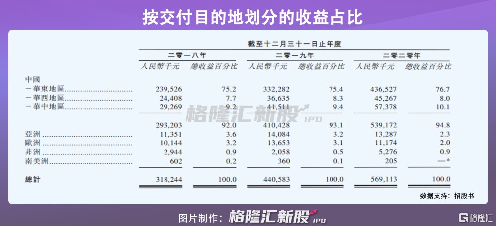 不過,雖然環球新材業務覆蓋了 30 多個國家和地區,但從招股書中的按交付目的地劃分的收益來看,中國市場貢獻了公司近 95% 的收入,特別是華東地區,在公司總收益中的佔比在 75% 以上。