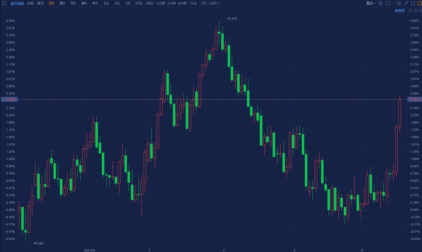 與此同時,美元指數一路上漲。截至發稿,美元指數報 91.93,本週已經上漲超過 1.5%,在週三和週四兩日更是連續拉出陽線。