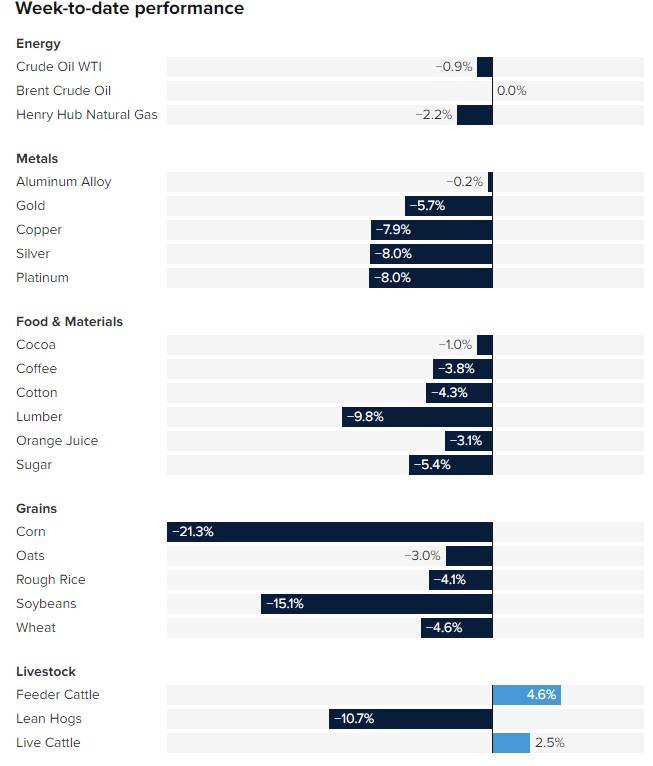 根據 CNBC 統計,如果將時間軸拉長至本週的話,幾乎所有主要大宗商品的價格均出現了下跌,其中玉米和大豆錄得兩位數跌幅,而其他主要品種的跌幅也大多超過 4%。