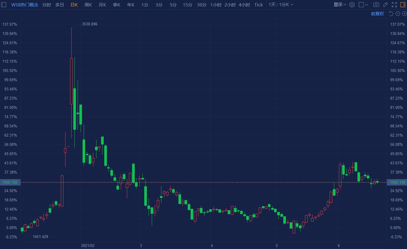 而散户抱團股年內也出現了類似的回調。根據富途的數據,依照 Wallstreetbets 中熱門討論標的建立的 “WSB 熱門概念” 指數曾在不到一個月出現翻倍行情,但在 1 月下旬觸及年內高位之後,接下來 4 個月一度大跌近 60%,目前大體位於 2 月末的震盪區間附近。