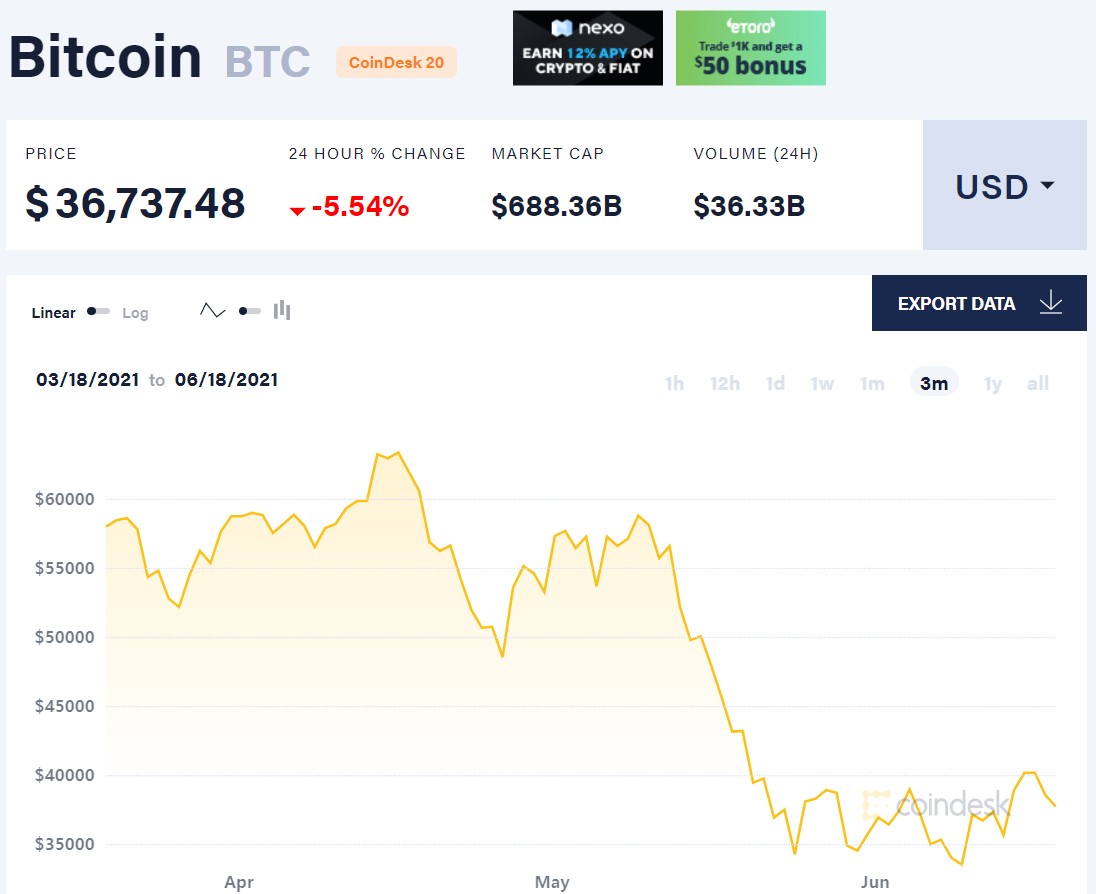根據 CoinDesk 的數據,比特幣在今年 4 月中旬突破 63000 美元創下歷史新高之後,截止目前已經下跌超過 40%,而在最近 24 小時則下跌了 5.54%。