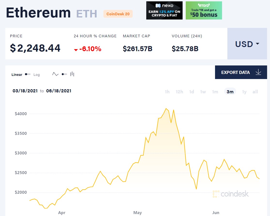 以太幣同樣也在暴漲之後出現了大幅下跌,從 5 月創下的歷史新高起算,已經下跌超過 45%,今日下跌 6.10%。