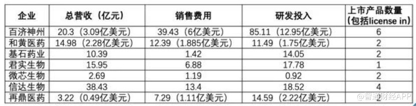 總體來看,7 家企業 2020 年營收最高的信達生物 38.43 億元,且僅有其做到在收入超過 10 億元的同時覆蓋研發和銷售費用,而其餘企業均入不敷出。7 家企業中銷售費用和研發投入最高的則是百濟神州,分別為 6 億美元 (約合 39.43 億元)、12.95 億美元 (約合 85.11 億元)。