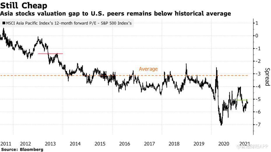 與 2013 年相比,這一差距更大。2013 年,時任美聯儲主席伯南克 (Ben Bernanke) 引起的縮減恐慌,導致亞太指數大跌約 11%。但是該年亞洲股市的市盈率較美國股市略低 1.5 個百分點,而 2021 年的平均市盈率相差 5 個百分點。