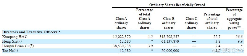 截至 2021 年 3 月 31 日,公司創始人、董事長兼首席執行官何小鵬持有公司 22.7% 的股權,投票權為 56.6%;公司董事及高管合計持有公司 30.9% 的股權,投票權為 70.5%。