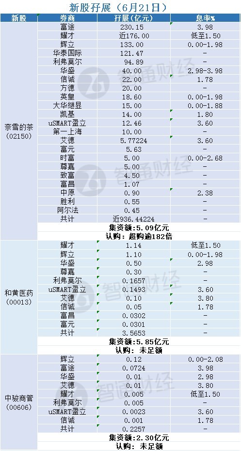 智通財經 APP 獲悉,奈雪的茶 (02150)、和黃醫藥 (00013)、中駿商管 (00606) 正在招股中。截至 6 月 21 日,富途、輝立、耀才等合計分別為其借出近 936.44224 億港元、3.5653 億港元及 0.2257 億港元;其中,奈雪的茶超購逾 182 倍,和黃醫藥、中駿商管未足額。