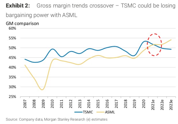 作為台積電 EUV 光刻機供應商,目前 ASML 已超越其大股東獲得更高毛利率。
