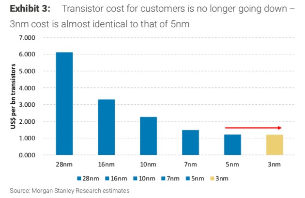 部分原因是,台積電同艾司摩爾(ASML)等關鍵設備供應商的議價能力正在減弱。摩根士丹利提到,根據 3 納米晶圓的初步定價,成本較 5 納米並沒有進一步下降,意味着摩爾定律的成本優勢已經結束(Exhibit 3)。一些替代技術,諸如先進的 3D 封裝,在提升芯片性能的同時,也可能削弱市場對 3 納米、2 納米制程的需求。